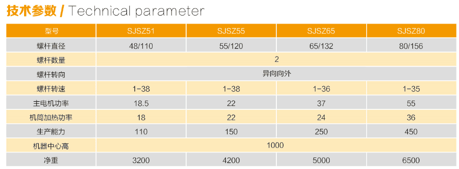SJZ系列锥形双螺杆挤出机是一种混炼、挤出设备。具有剪切效率小,物料不易分解,塑化混炼均匀,产量高,自洁性好,适应范围广等优点。PVC粉料直接成型。采用自动温控,真空排气,螺杆芯部油冷,机筒冷却有风冷和油冷两种。主电机及喂料电机可分别采用交流变频调速系统或直流调速系统。